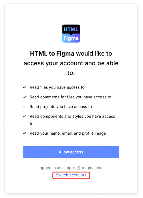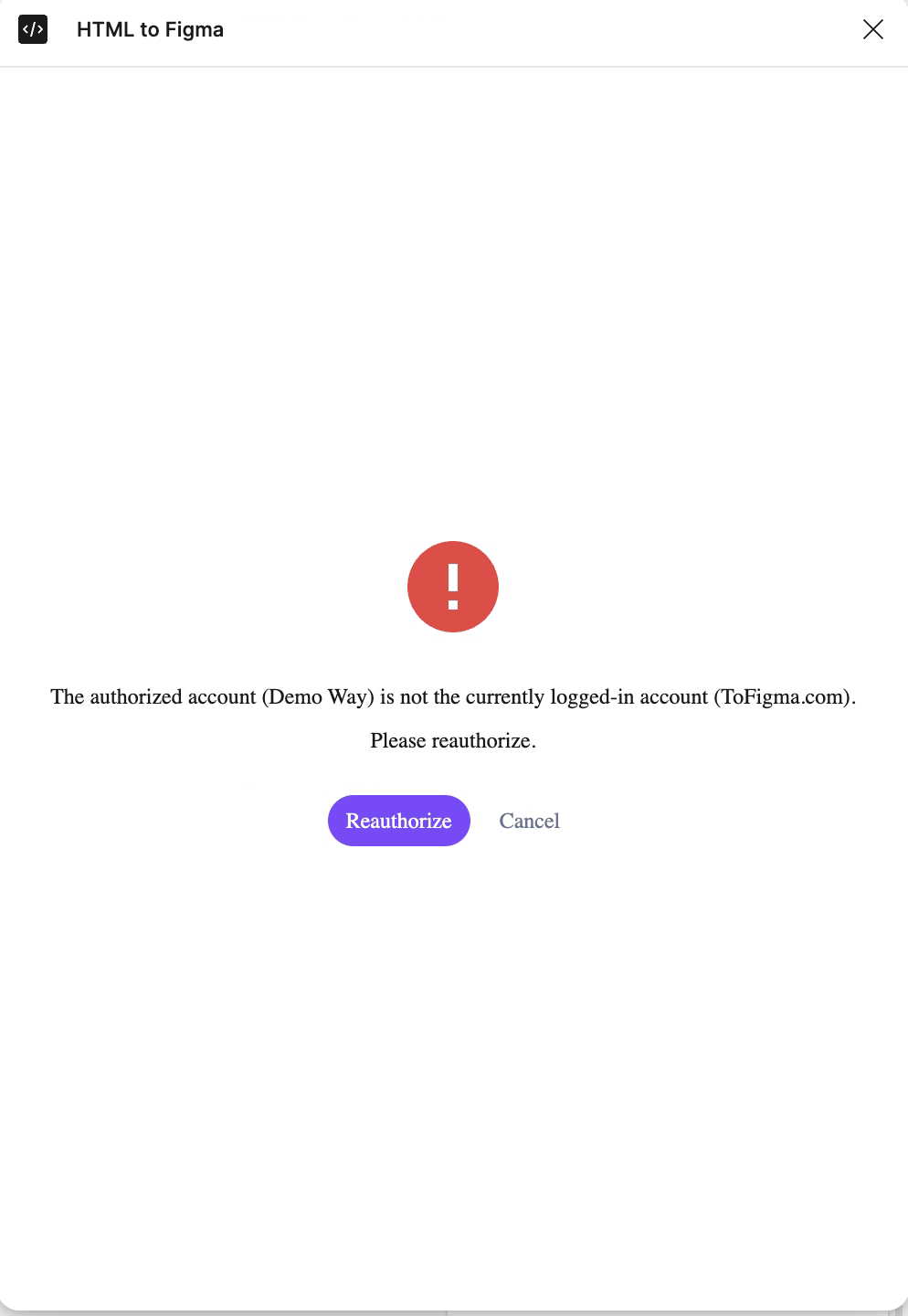 Using multiple Figma accounts is common among users, and when we first authorize the HTML to Figma plugin in Figma, we might encounter the following issue: